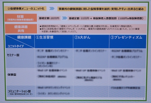 「情報」では、健康診断情報から、健保組合が『健康スコアリングレポート』『健康白書』を作成し、各事業所へ情報提供します。さらに医師監修の『健康すこやかレポート』をつけて各事業所の健康課題に基づくユニット事業を提案します。「お金」は、基礎定額にプラスして被保険者人数加算(加算分×被保険者数)の補助金をつけています。そして「メニュー」として、①生活習慣病、②5大がん、③プレゼンティーイズムの3つの健康課題ごとに、セミナー型、体験型、コミュニケーション型のプログラムやイベントを、さまざまなベンダーと提携して提案しています。保健事業のユニット化の取り組みは3年目になりますが、毎年メニューの見直しも行っています。