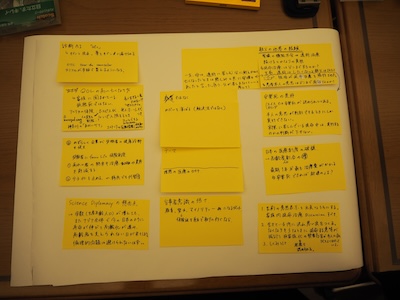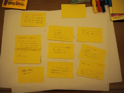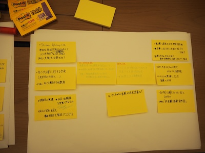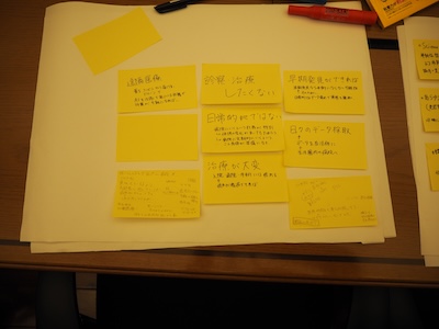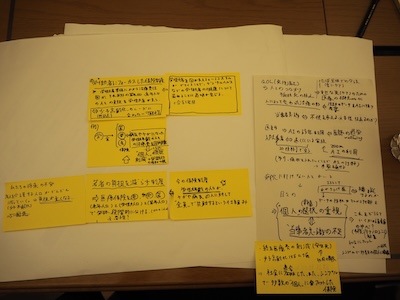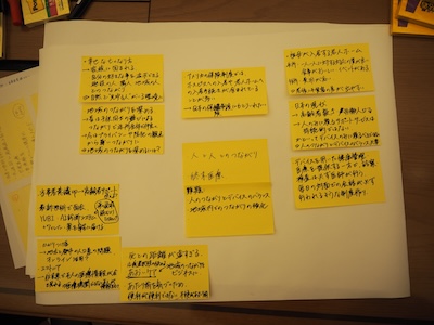 この日は、勉強会で学んだことを踏まえて、個々が感じている課題を可視化し、アイデアを膨らませるためのグループワークを実施。それぞれの目の前にあるまっさらな用紙の真ん中に、「私は何を伝えたいのか」というコアとなるキーワードを置き、頭の中にあることを付せんに書き出して貼り付けていき、用紙が付せんで埋められた頃合いを見て、意見交換の時間に移りました。