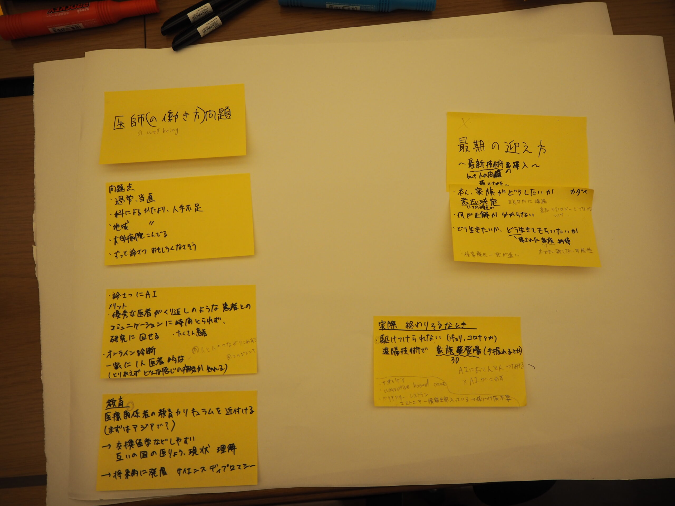 一人ひとりの想いを語ってもらう場面では、ファシリテーターが学生が持つ課題の背景にある本質を探るうちに、本人と仲間の間にセッションが生まれ、「そもそも医療とはどうあるべきか」「どんな社会にしたいのか」という問いに発展していきました。